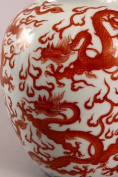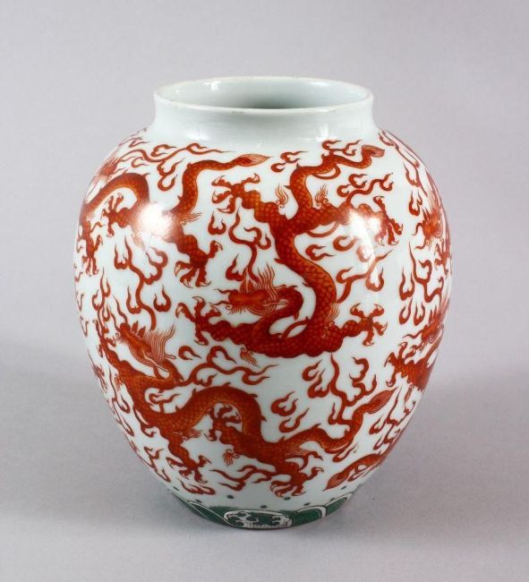 A CHINESE FAMILLE ROSE DRAGON JAR, painted with red dragons and with wave decoration to lower, the base with qianlong mark, possibly lacking cover, 18cm high