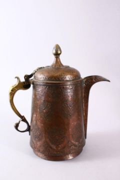 A 19TH CENTURY INDO PERISAN TINNED COPPER CALLIGRAPHIC JUG / EWER, the body with carved floral panels, traces of tin, with bands of Persian script / calligraphy, 29cm high