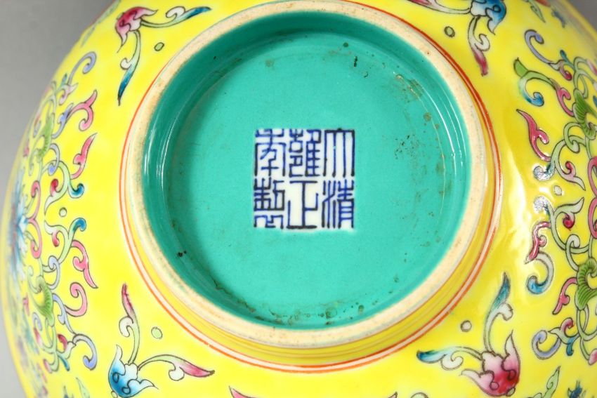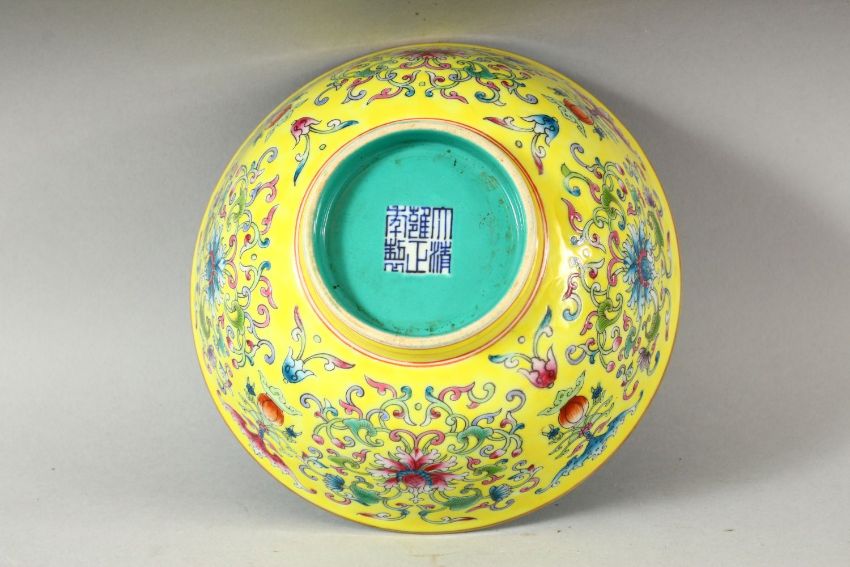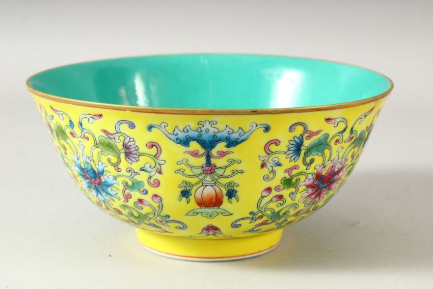 A CHINESE FAMILLE JAUNE PORCELAIN BOWL, the interior with turquoise ground, the exterior painted with flowers and bats, six character mark to base, 16.5cm diameter.