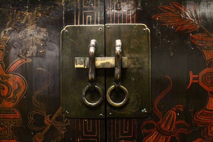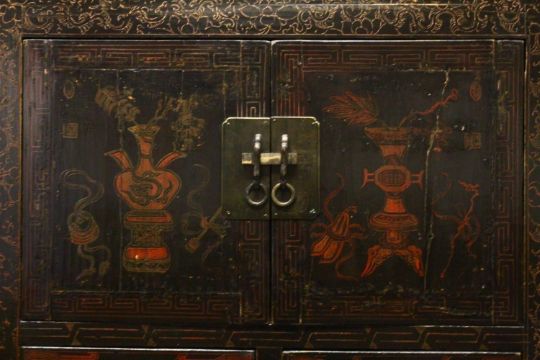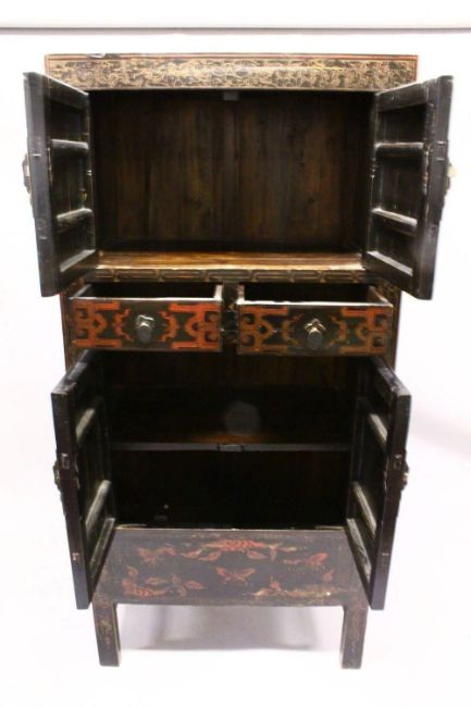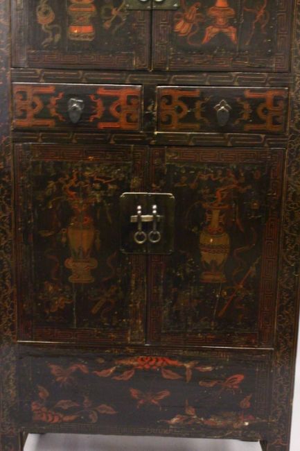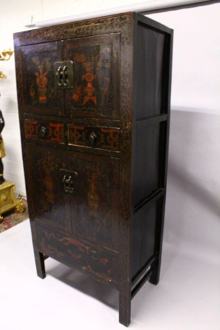 A LATE 18TH CENTURY CHINESE BLACK LACQUER 'HAT CHEST', SHANXI PROVINCE, comprising a pair of doors over two short drawers and two further large doors, all painted with vases of flowers and prunus trees and other Chinese symbols, 187cm high, 89cm wide, 52cm deep.