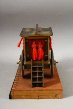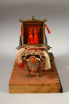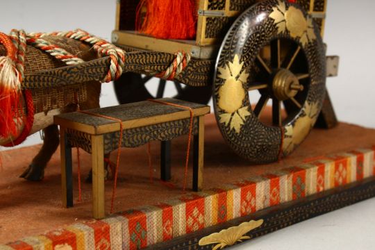 A JAPANESE GILT LACQUER CART AND OX DOLL ON STAND, overall 31.5cm long.