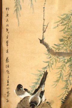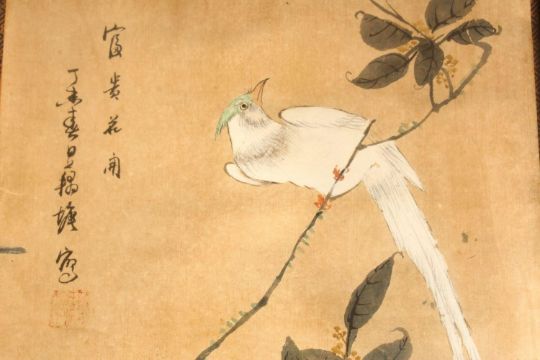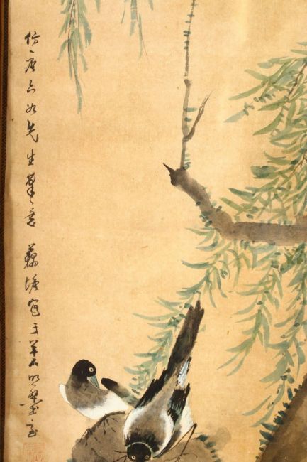 A LARGE PAIR OF HARDWOOD FRAMED CHINESE SCROLL PAINTINGS, each depicting scenes of birds amongst trees, with large carved hardwood frames, 131cm x 38cm.