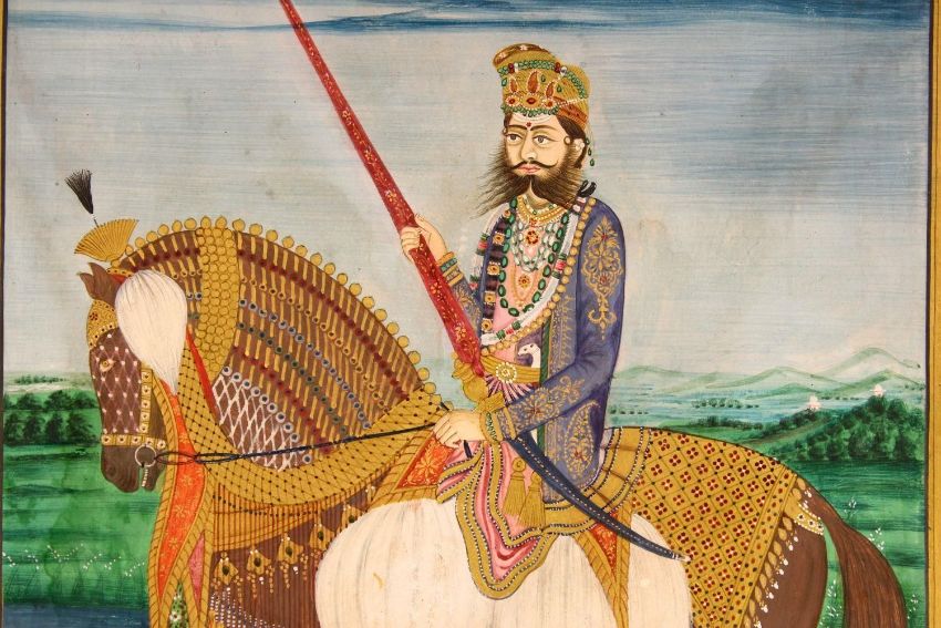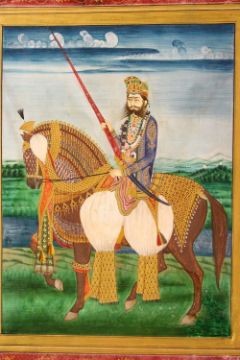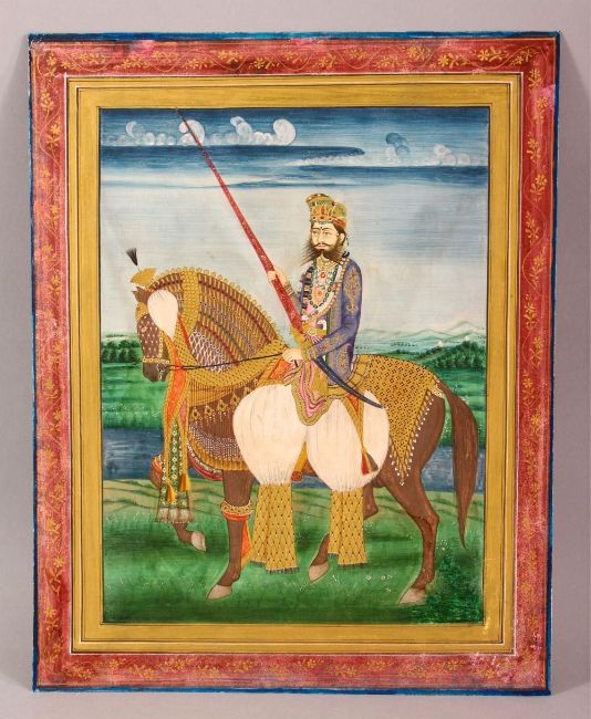 A FINE LARGE INDIAN MINIATURE PAINTING OF MAHARAJA SAWAI RAM SINGH II of Jaipur (ruled 1835-1880) on horseback, profuse use of gold on paper with opaque watercolour, North India, Jaipur, circa 1880, 30cm x 23.5cm.