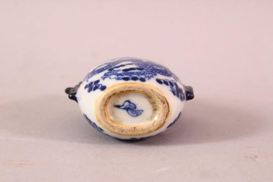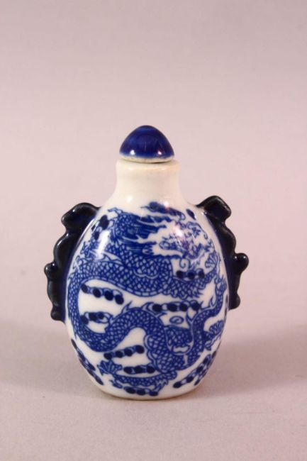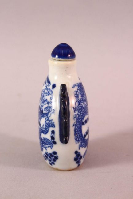 A CHINESE BLUE AND WHITE TWIN HANDLED PORCELAIN SNUFF BOTTLE, painted with dragons, 7cm.