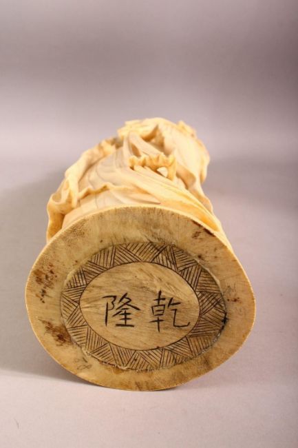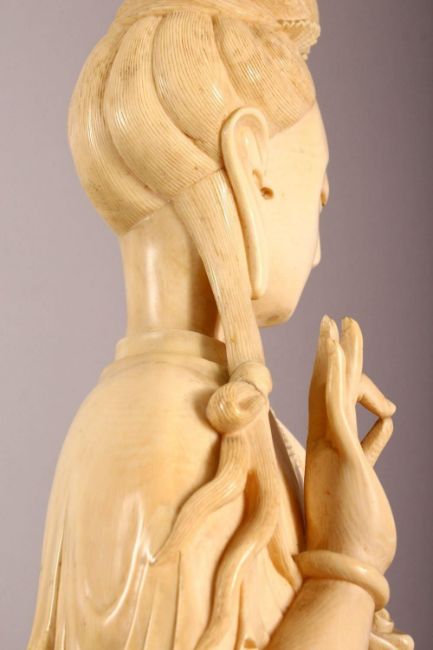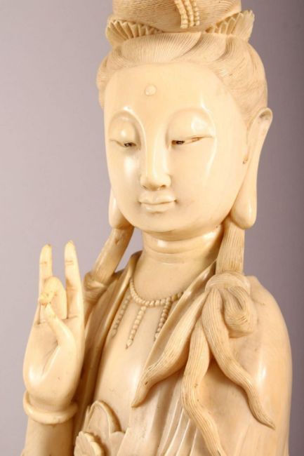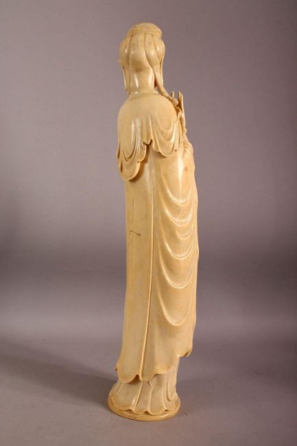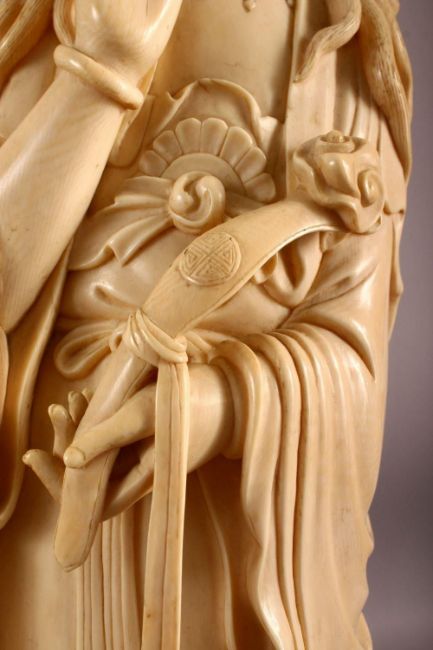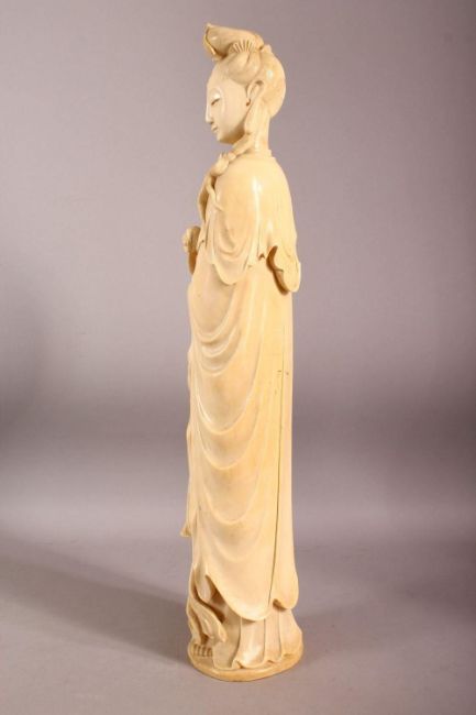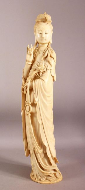 A SUPERB LARGE CHINESE IVORY TUSK CARVING OF A STANDING GUANYIN, the right hand raised, her left hand holding a scepter, signed to the base, 57cm high. Weight 4800g.