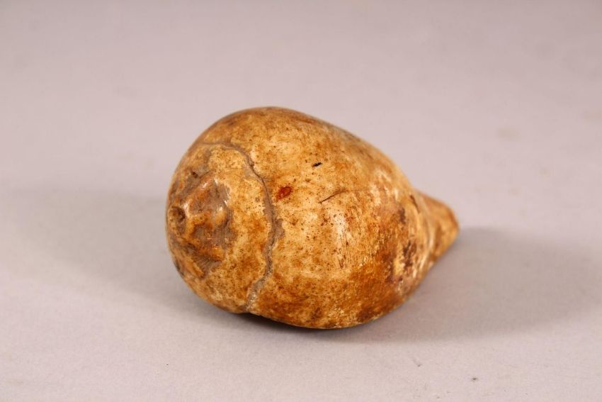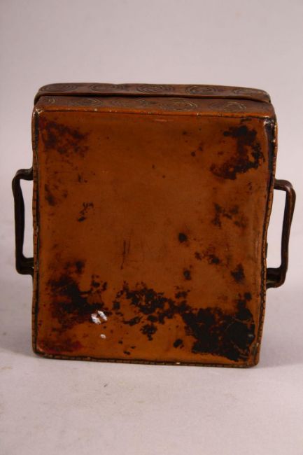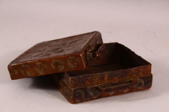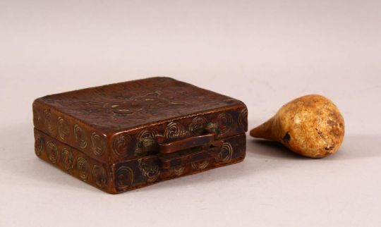 AN EARLY TIBETAN CEREMONIAL SHELL AND AN 18TH CENTURY COPPER BOX, the shell possibly 16th century, the box depicting shell design and calligraphy, box 11cm x 11.5cm.