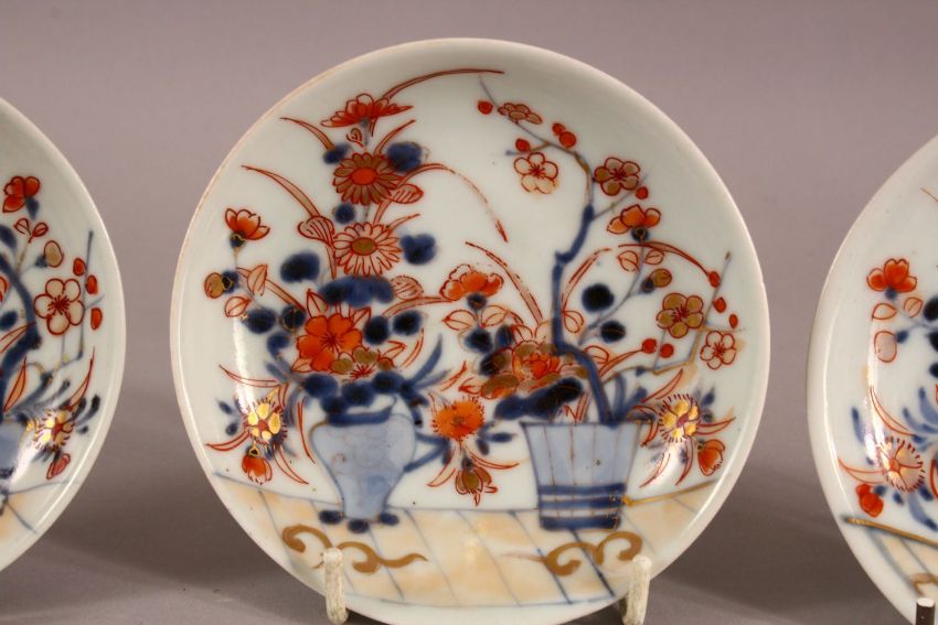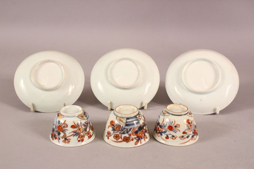 A MIXED LOT OF THREE CHINESE IMARI TEA BOWLS & SAUCERS - Each decorated in similar style with flora - tea bowl : 6cm saucers: 11cm
