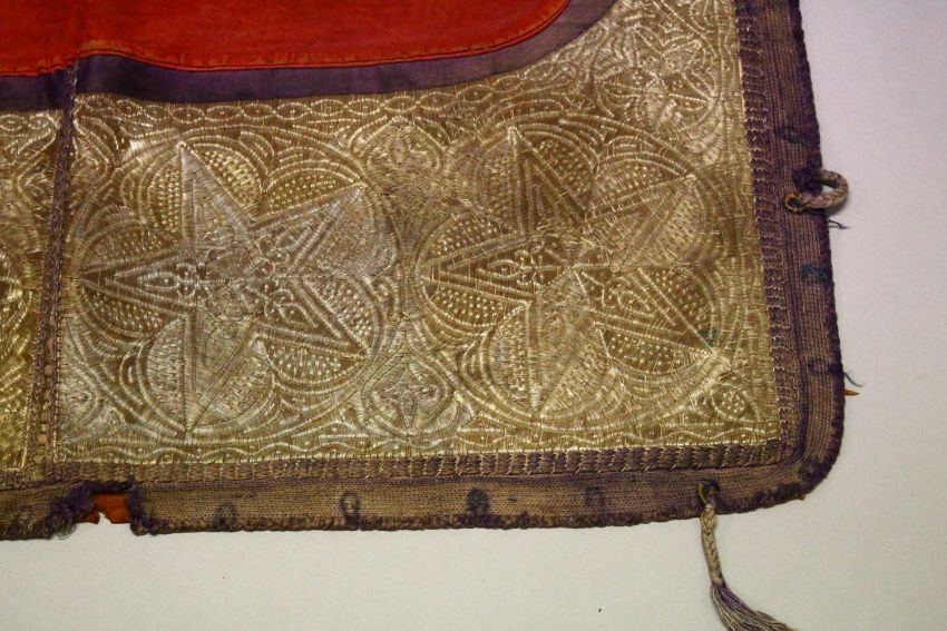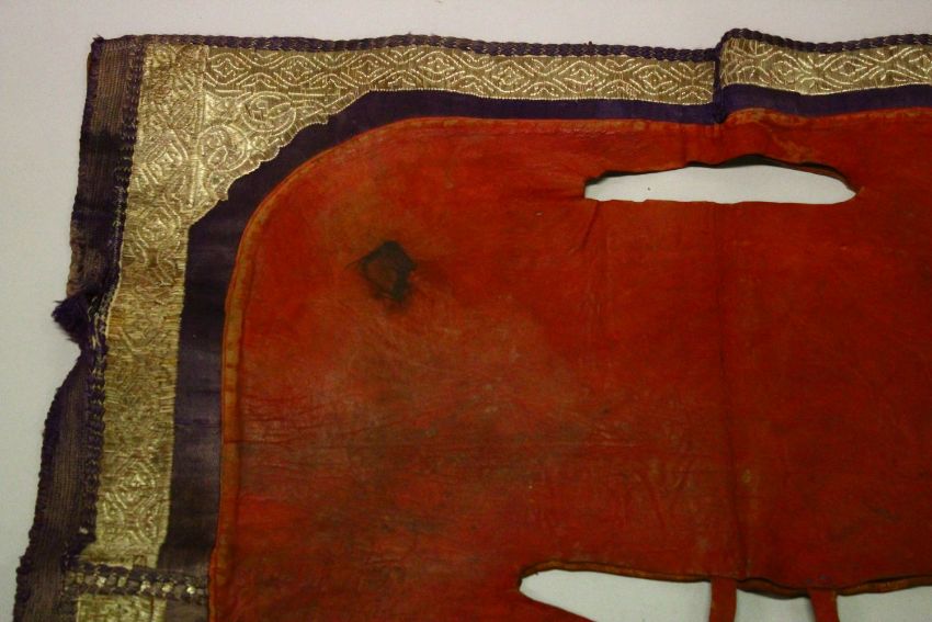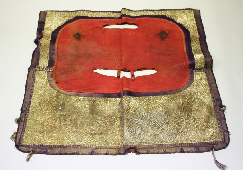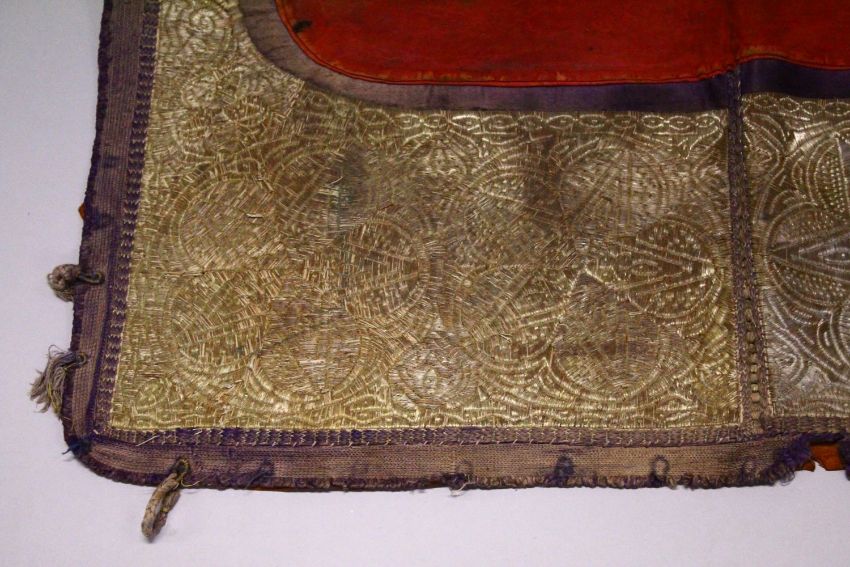 A FINE 19TH CENTURY OTTOMAN METAL THREADED LEATHER HORSE SADDLE COVER, 98cm x 104cm.