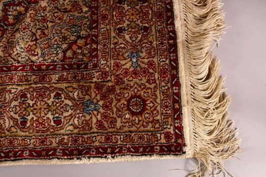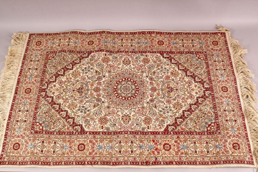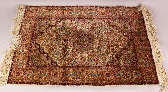 A SMALL TURKISH SILK RUG, 91cm X 62cm.