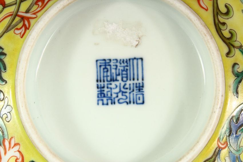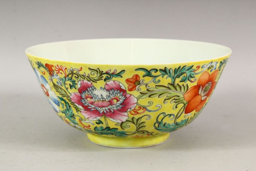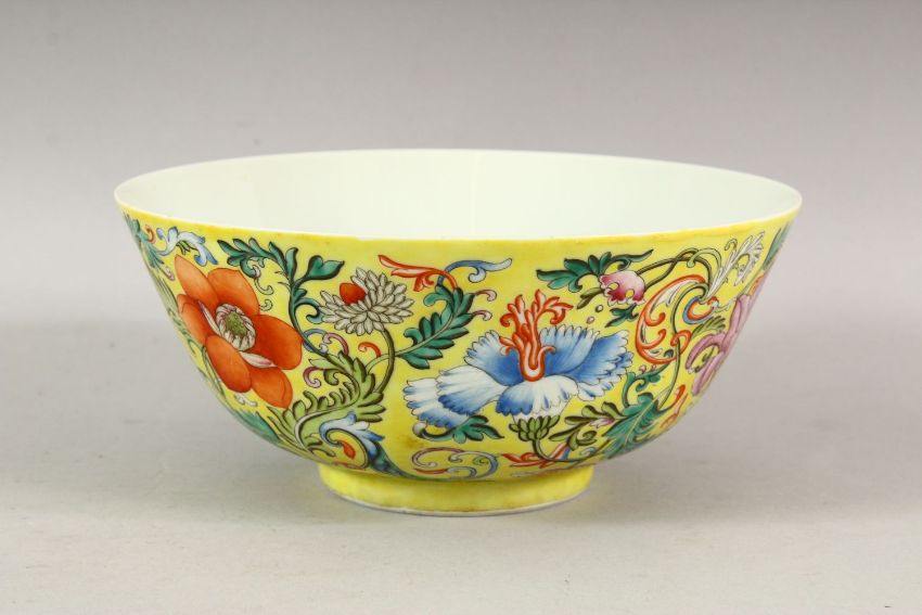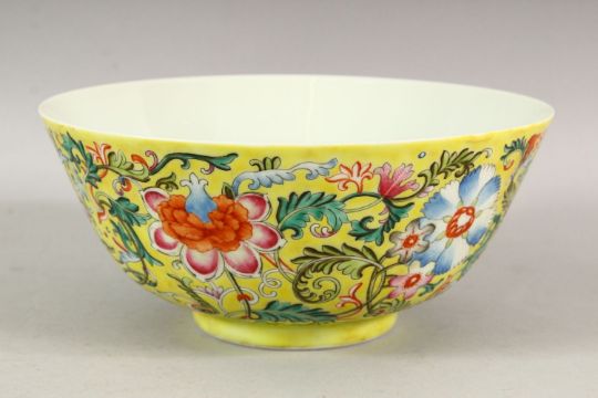 A GOOD CHINESE FAMILLE JAUNE BOWL, the centre painted with bats, the sides with a continuous design of flowers on a yellow ground, six character mark in blue, 21cm diameter.