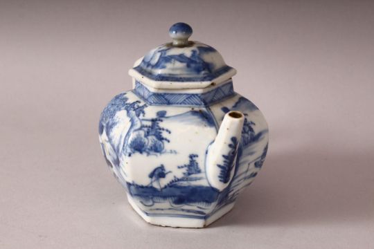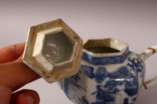 A 18TH / 19TH CENTURY CHINESE BLUE & WHITE PORCELAIN TEAPOT - decorated with native landscape views, 11cm high.