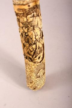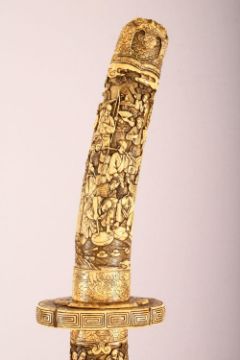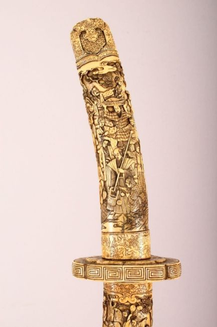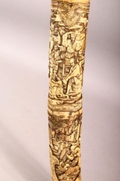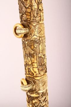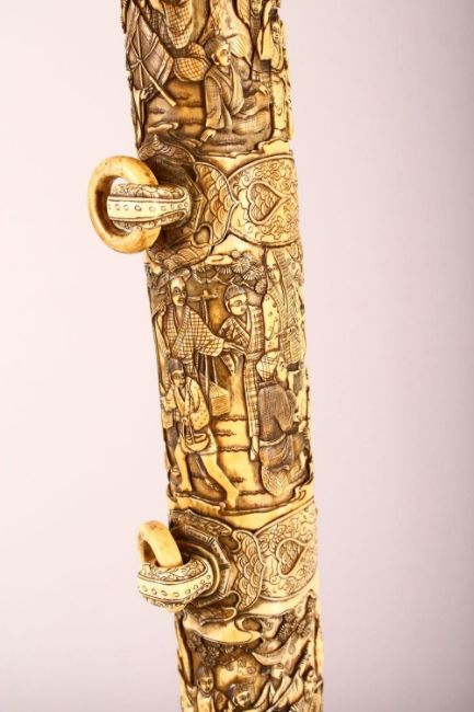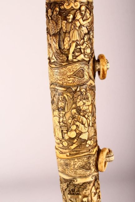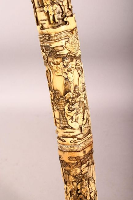 A LARGE JAPANESE MEIJI PERIOD CARVED SECTIONAL IVORY KATANA - carved in relief depicting many figures including women an children undertaking daily activity, some playing instruments, some with fans or flora, some fishermen with the days catch, the blade carved with flora and butterflies, with twin loops, 87.5cm long. tang with pin but poss glued in.