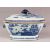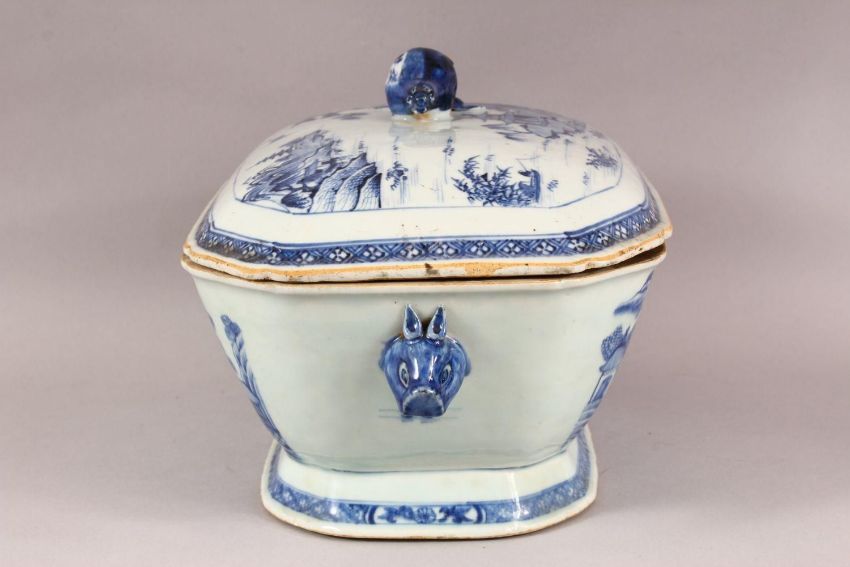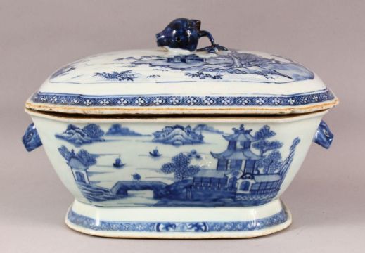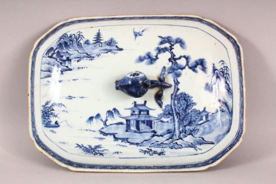 AN 18TH CENTURY CHINESE BLUE & WHITE PORCELAIN TUREEN & COVER, decorated with landscape views with twin handles and a fruit finial, 35cm wide