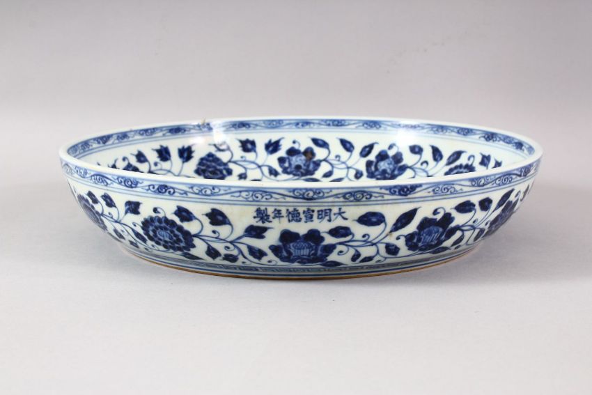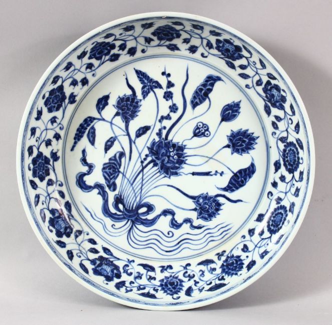 A LARGE CHINESE BLUE AND WHITE DISH, painted with flowers, with six character mark to the side, 32cm diameter.