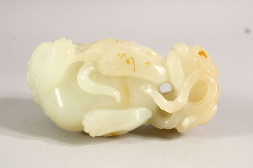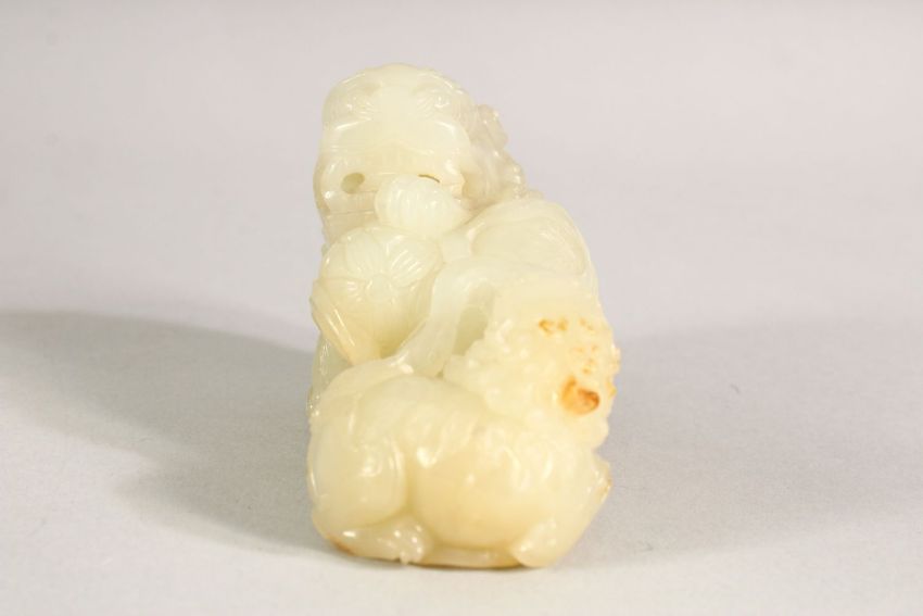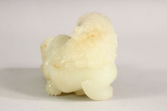 A GOOD CHINESE CARVED JADE FIGURE OF TWO DOGS OF FO, 9cm long.
