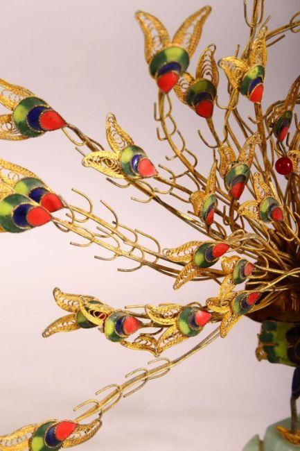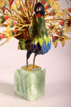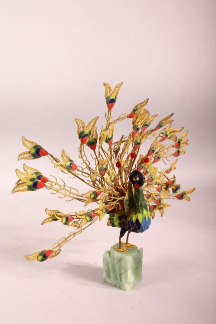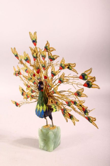 A DECORATIVE GILT METAL AND ENAMELLED MODEL OF A PEACOCK, plumage on full display, mounted on an onyx base, 25cm high.