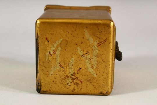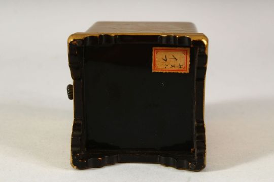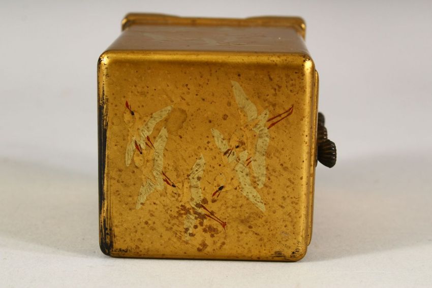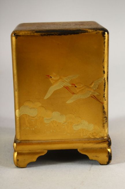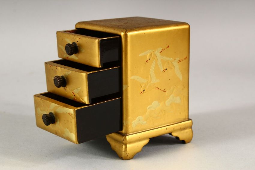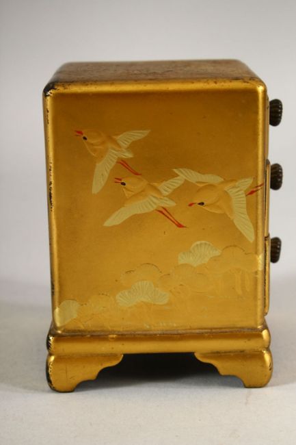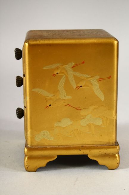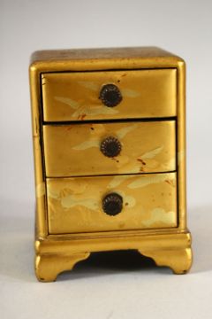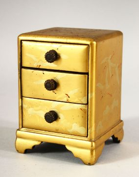 A SMALL JAPANESE GILT LACQUER CHEST, comprising three small drawers, supported on four bracket feet, decorated with birds, 8.5cm high.