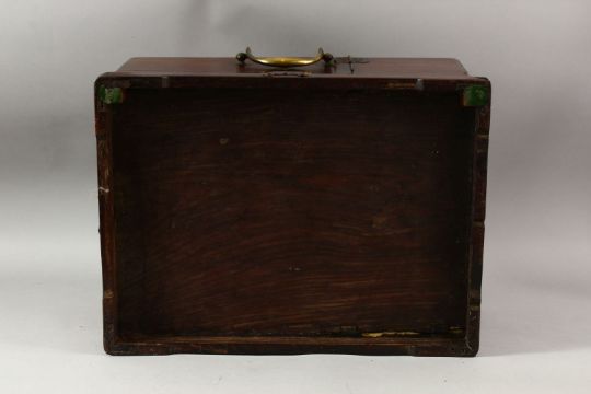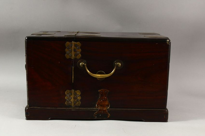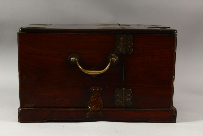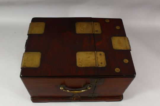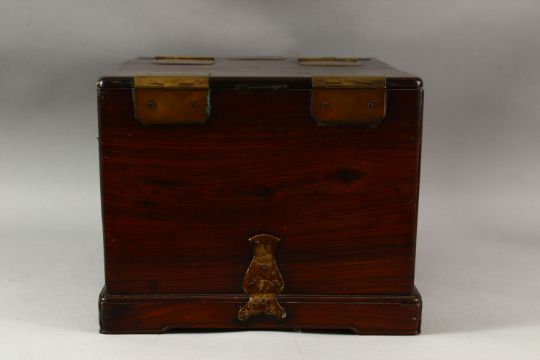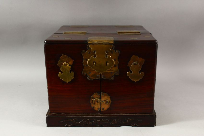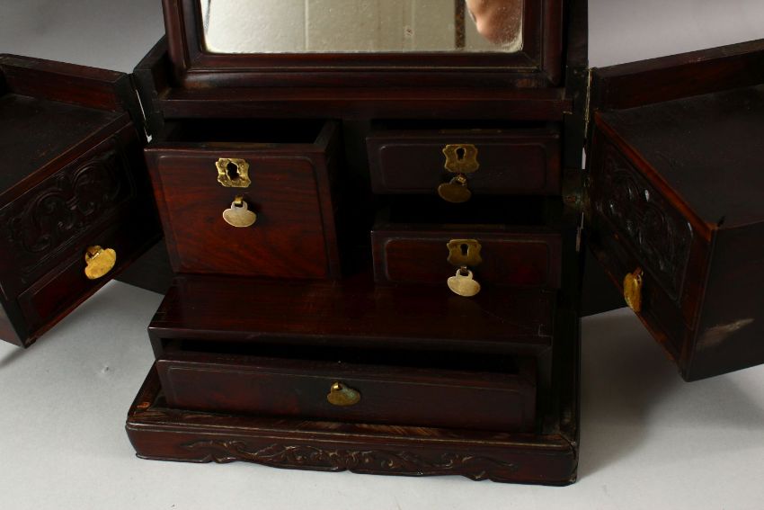 A LARGE CHINESE POSSIBLY ZITAN WOOD COSMETIC BOX, comprising a hinged rising mirror, six drawers and two compartments with sliding lids, the box with brass fittings, pin lock (lacking pin) and hook latch, with two handles to the sides, 38cm x 27cm, 22cm high.