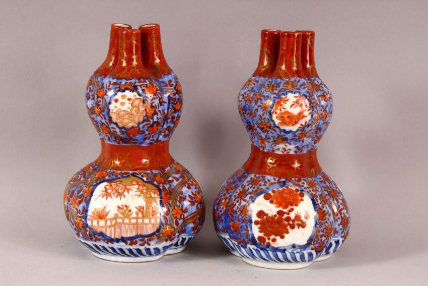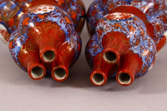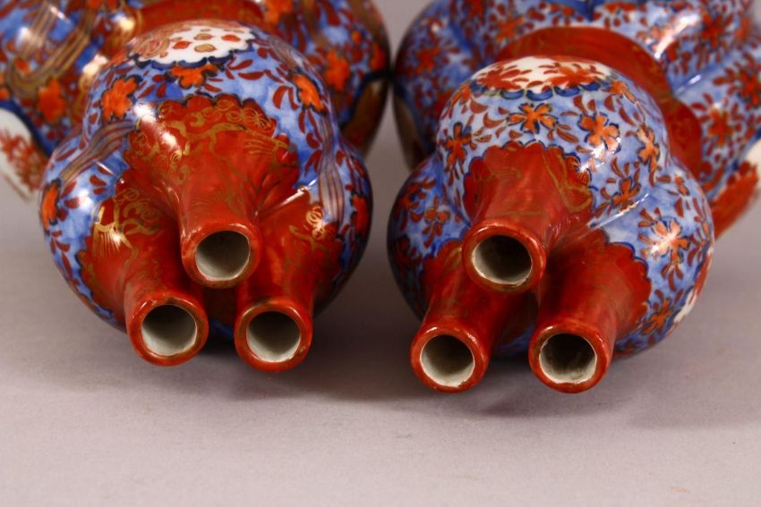 A PAIR OF ORIENTAL IMARI PORCELAIN GOURD VASES, each with three openings to the neck, in the form of double gourd, with panels of floa amongst blue & white ground, 18cm