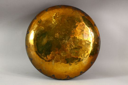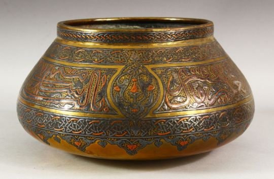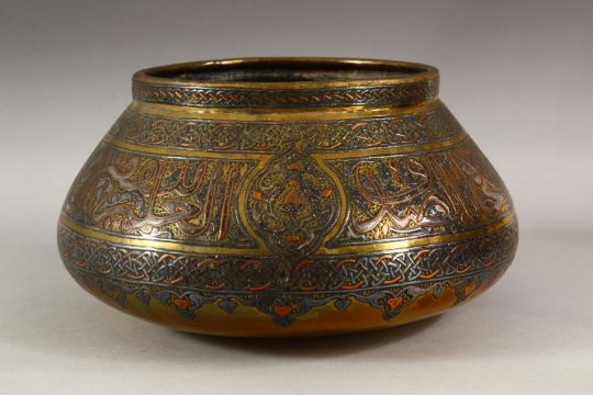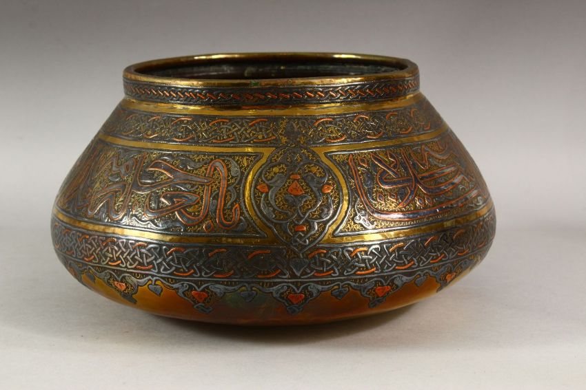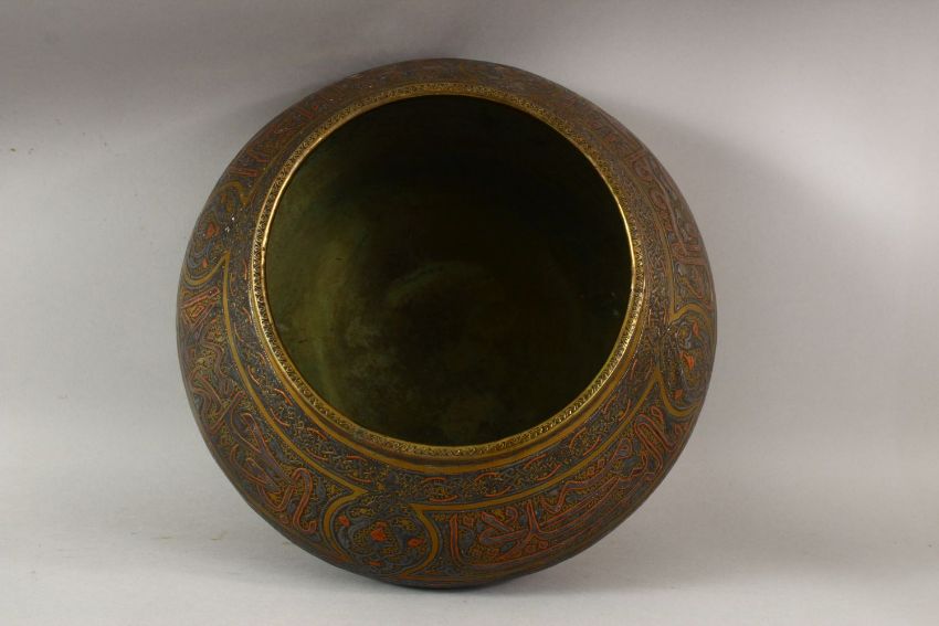 A GOOD LARGE DAMASCUS CAIROWARE SILVER INLAID BRASS BOWL, the body with a broad band of calligraphy, 28cm diameter.