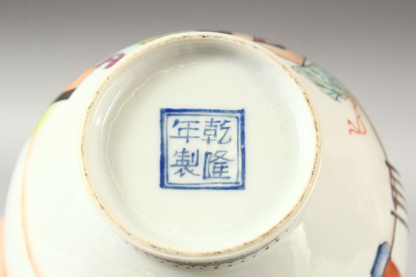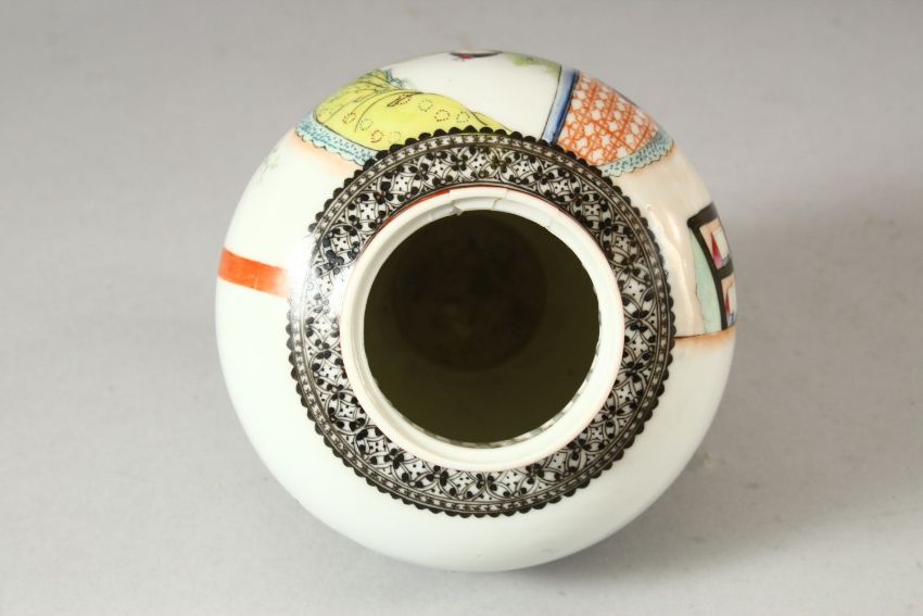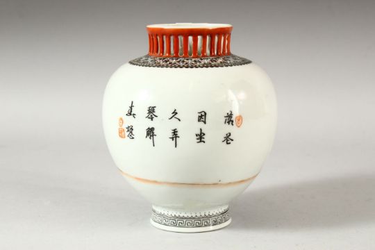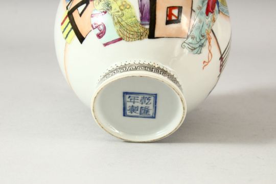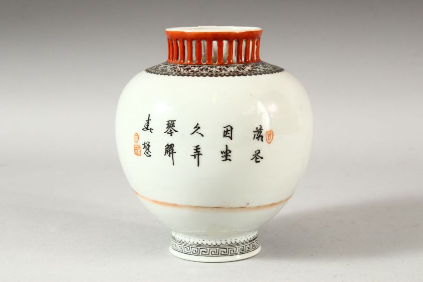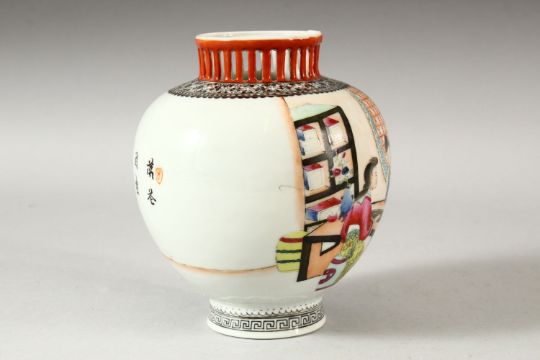 A CHINESE REPUBLIC PORCELAIN VASE, painted with female figures in an interior setting and script, the base with four character mark, 14cm high.