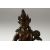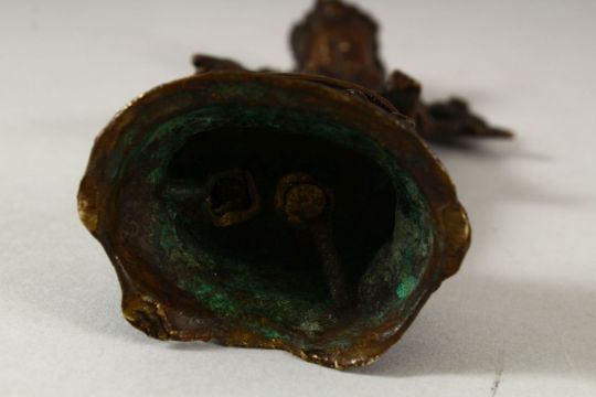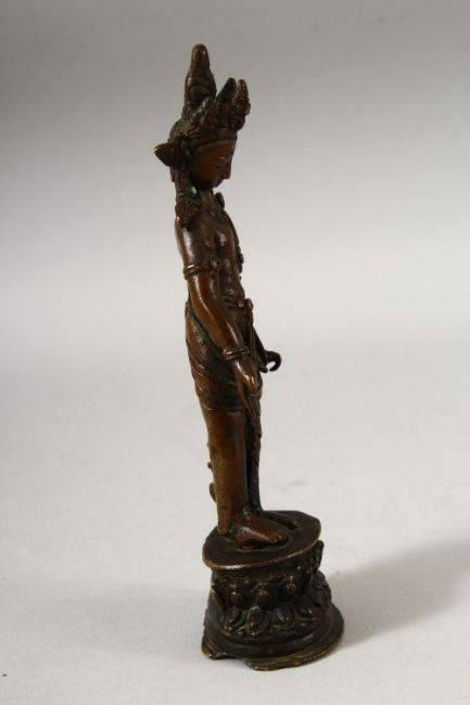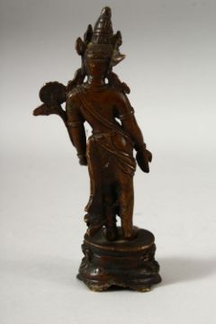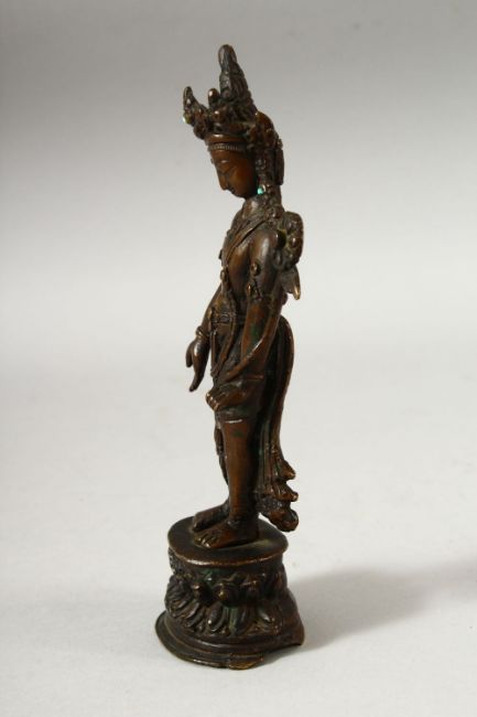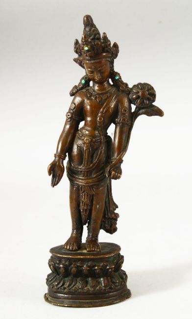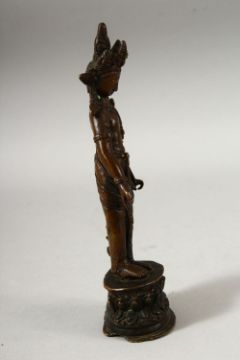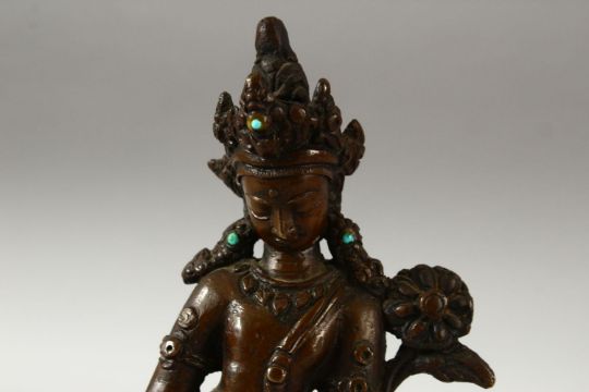 A SMALL INDIAN BRONZE FIGURE OF A DEITY, the head dress inset with small turquoise beads, fixed upon a bronze stand, 18.5cm high.