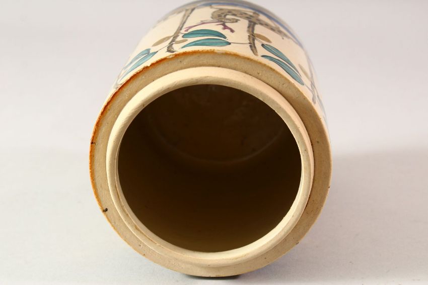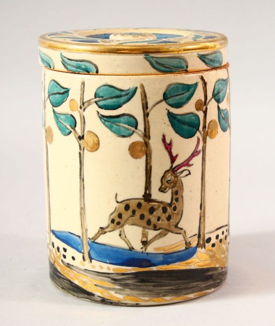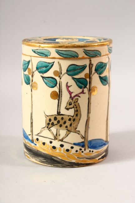 AN ISLAMIC DESIGN POTTERY JAR AND COVER, the jar painted with running deer amongst stylised blossom with gilt highlights, 16cm high overall.