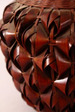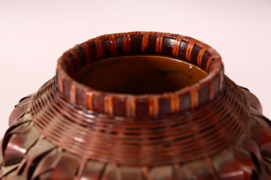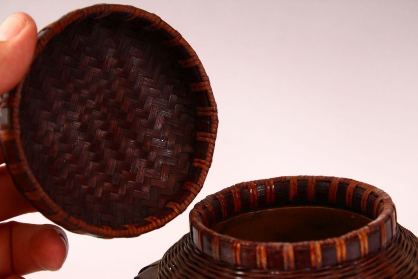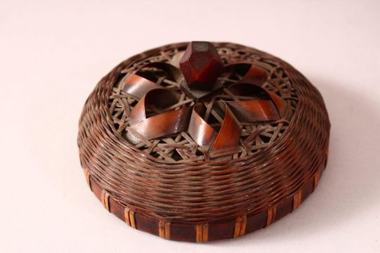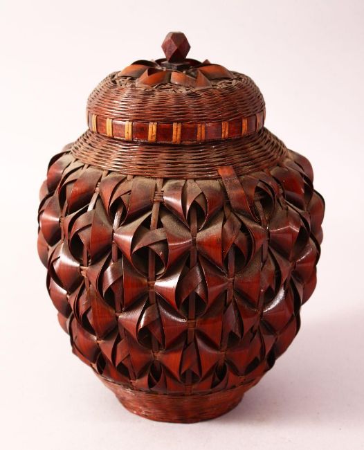 A JAPANESE MEIJI PERIOD WOVEN BAMBOO POT & COVER - for incense, with a porcelain liner, 19cm x 15cm