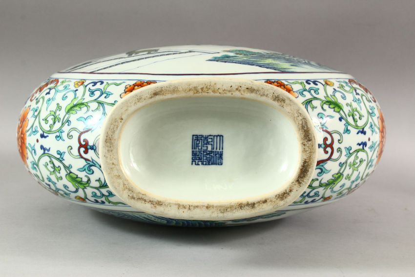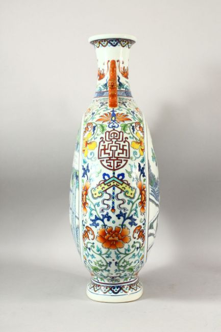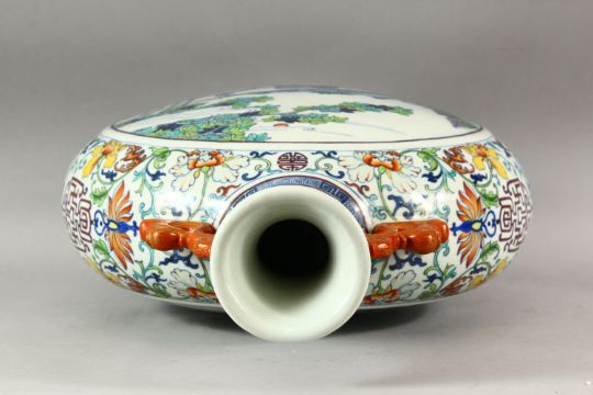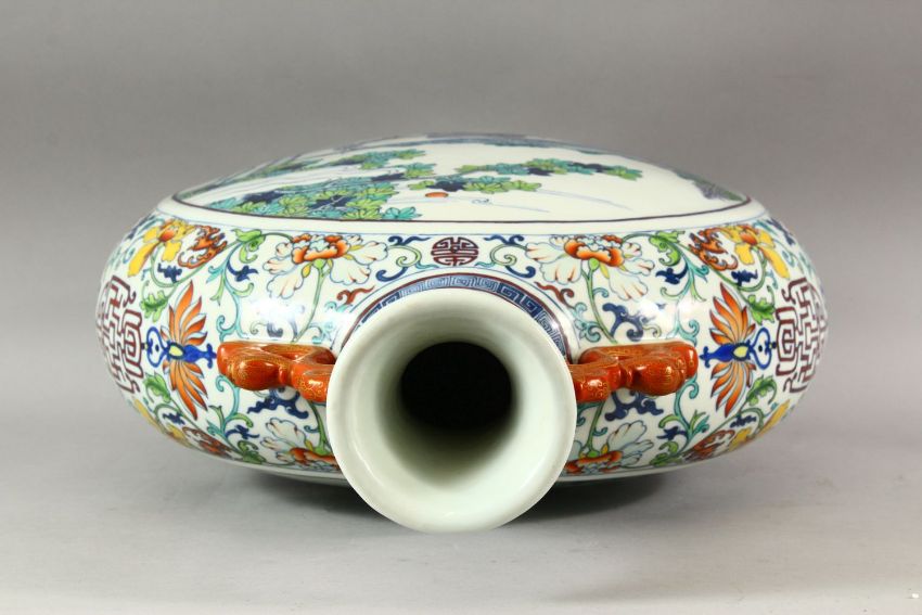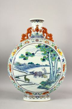A LARGE AND IMPRESSIVE CHINESE DOUCAI PORCELAIN TWIN HANDLE MOONFLASK, the body painted with a panel with a figure and a buffalo in a landscape setting, the handles in the form of kylins, 59cm high, 43cm wide.