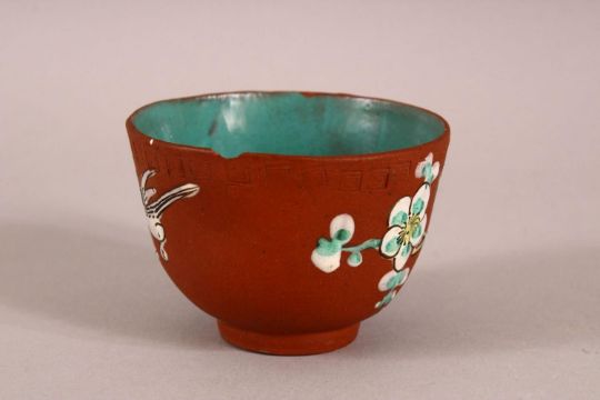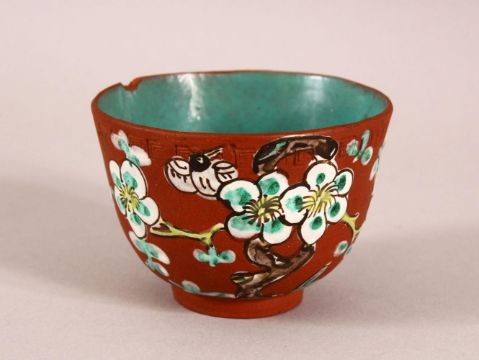A CHINESE YIXING CLAY TEA BOWL - the exterior enameled with birds and flora - the interior with a turquoise glaze - 7.5cm