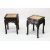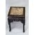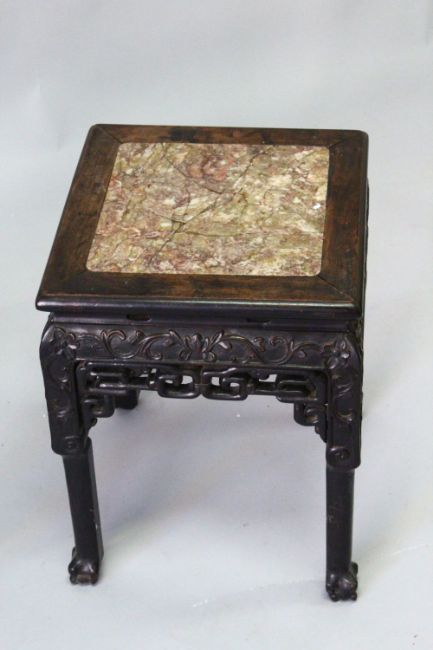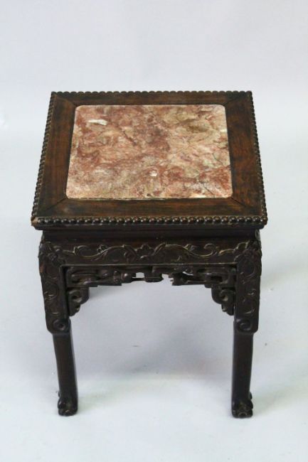 A PAIR OF CHINESE SQUARE FORM MARBLE INSET HARDWOOD STANDS, the frieze carved with bands of floral decoration, 48cm high, 35cm square.