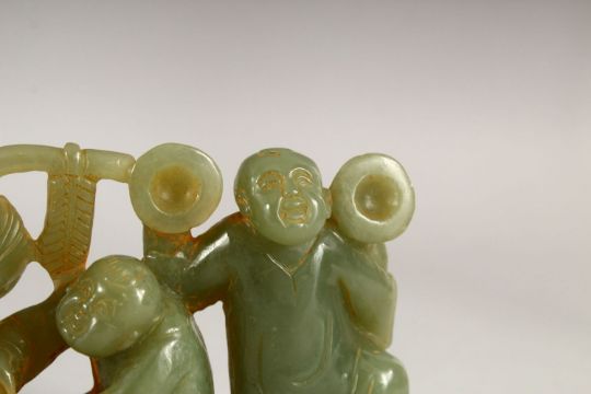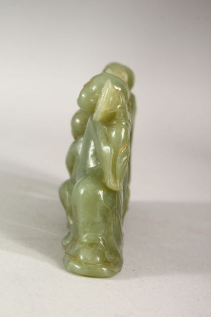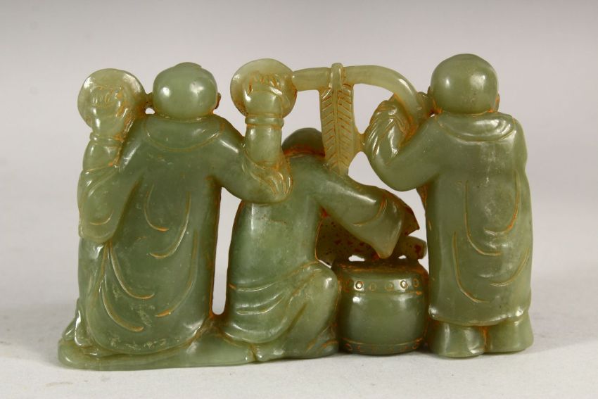 A CHINESE CARVED JADITE GROUP OF THREE MUSICIANS, 12.5cm wide.