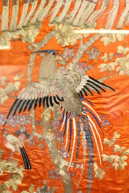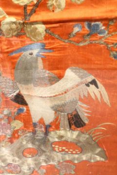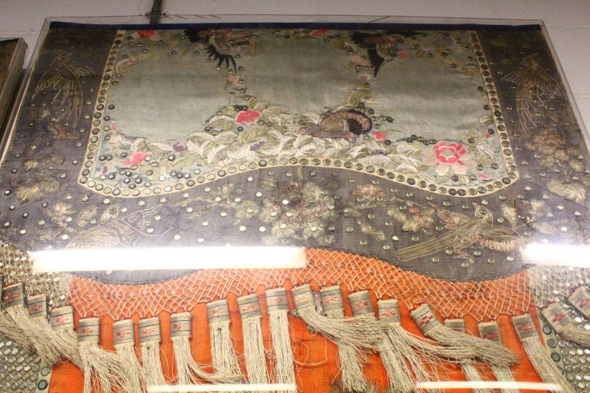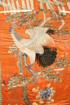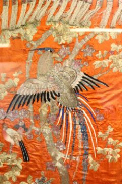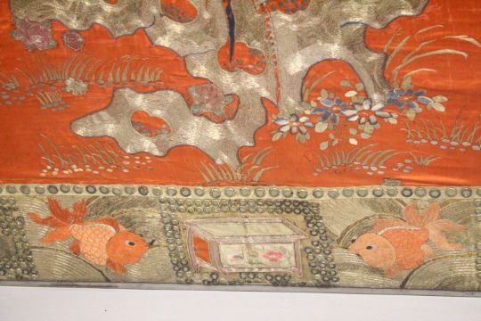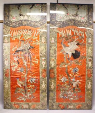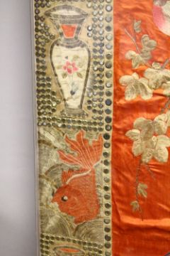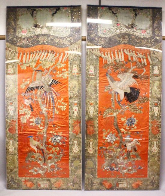 AN IMPRESSIVE PAIR OF CHINESE EMBROIDERED SILK PANELS, each central coral red ground panel embroidered with exotic birds perched upon trees below a pale blue floral panel with fringe and tassles, the border with mirrored roundels and decorated with fish, vases and other motifs, the tops folded over (complete), mounted on frames behind purpose built perspex covers, each 263cm high, 109cm wide.