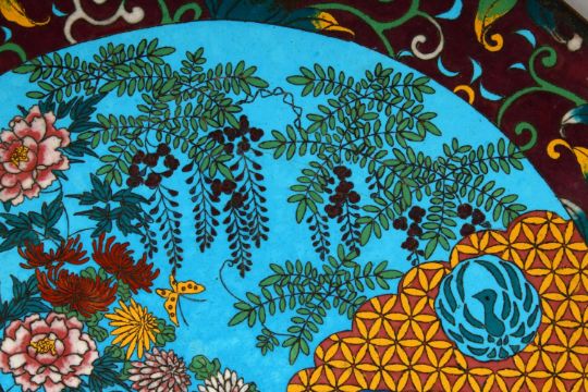 A CHINESE BLUE GROUND CLOISONNE DISH, depicting a cart with flowers, 31cm diameter.