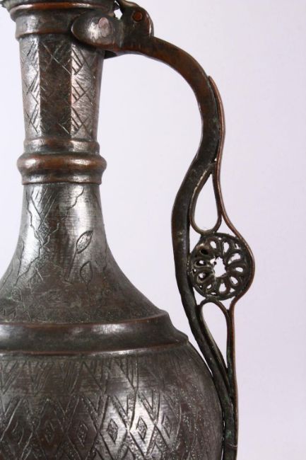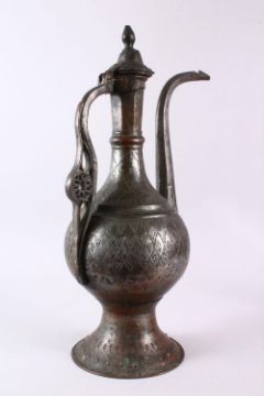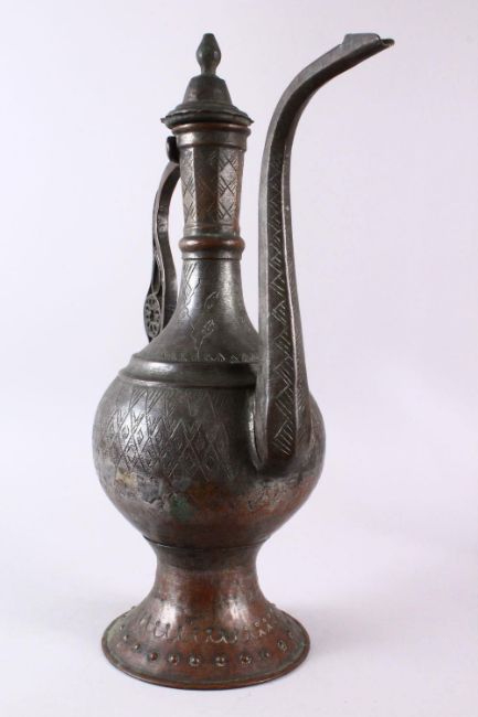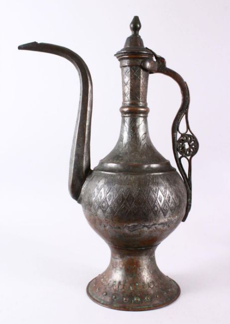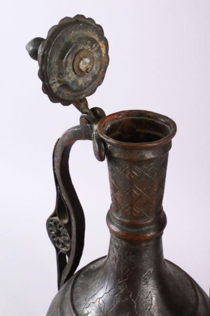 A LARGE 19TH ISRAEL TINNED COPPER EWER, with floral carved decoration and other chased design, traces of tin, 55cm high.