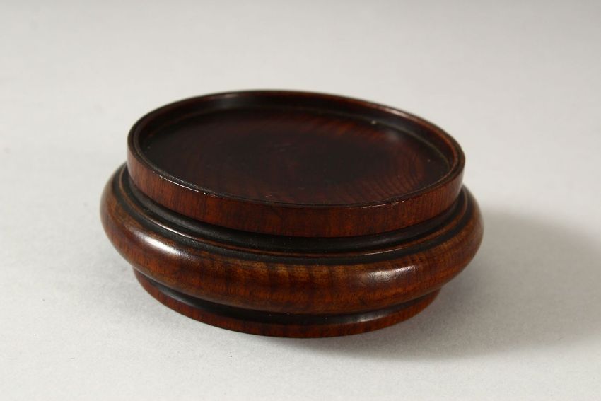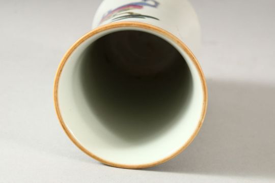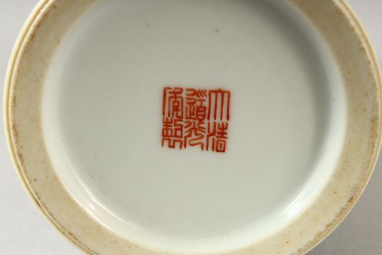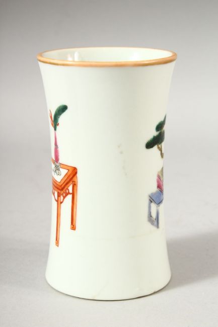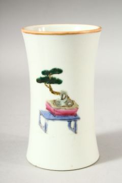 A SMALL CHINESE FAMILLE ROSE PORCELAIN BRUSH POT AND STAND, the body painted with a female figure, the base with red six character mark, overall height 15cm.