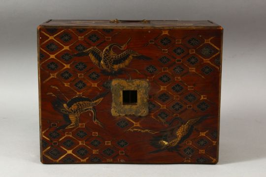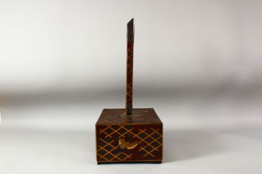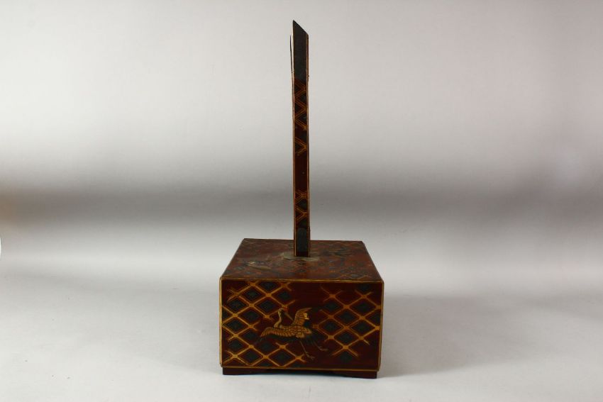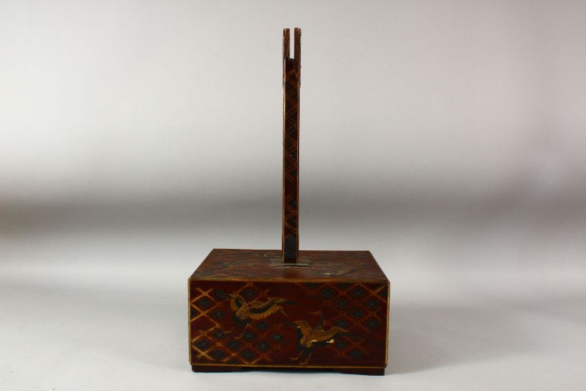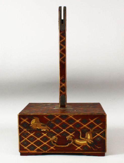 A JAPANESE WOOD AND LACQUER STAND, the base decorated with cranes and gilt latticework, the front containing a drawer, the base with a detachable support, 46cm high overall.