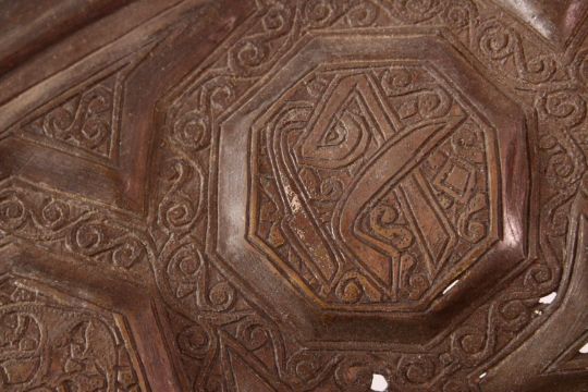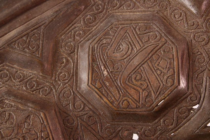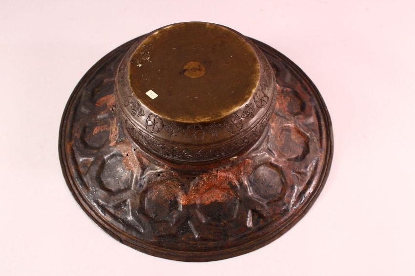 A LARGE 18TH CENTURY DAMASCUS MAMLUK REVIVAL BRASS BASIN, with traces of silver inlay, with embossed and chased decoration, 42cm diameter.