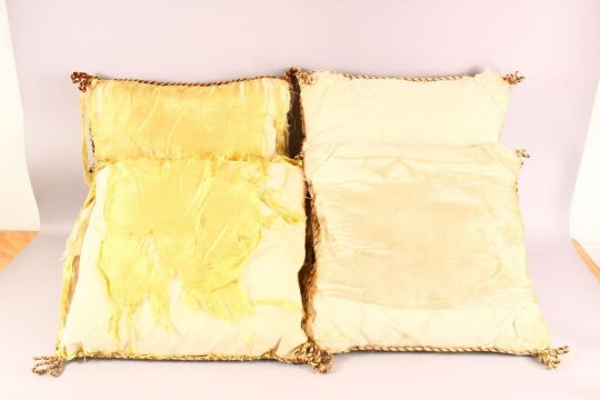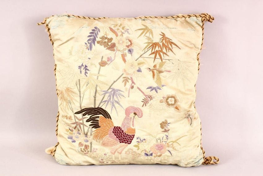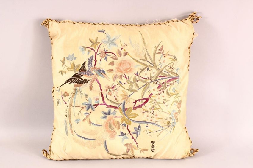 FOUR CHINESE EMBROIDERED CUSHIONS, each embroidered with birds and native flora, each approx. 45cm square.