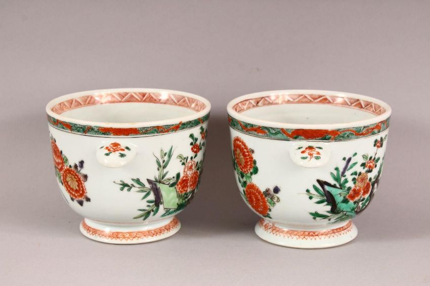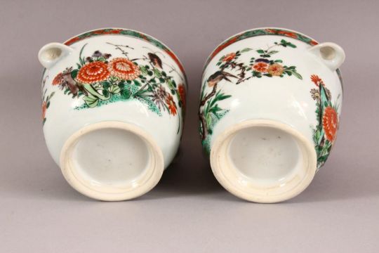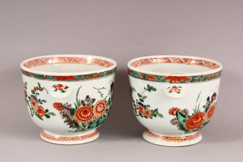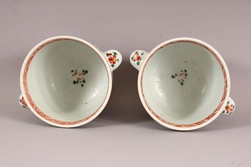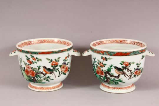 A PAIR OF 18TH / 19TH CENTURY CHINESE FAMILLE VERTE PORCELAIN COOLERS - each with twin handles and floral decoration to the body, 17cm wide