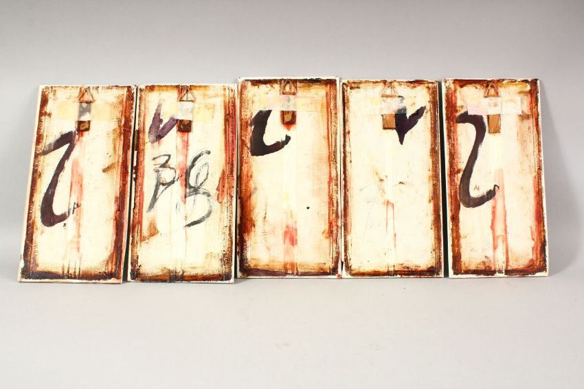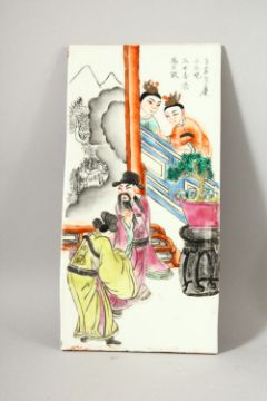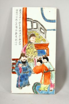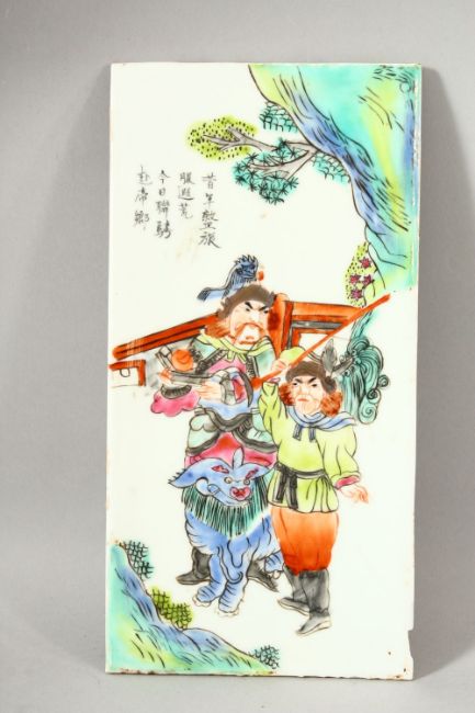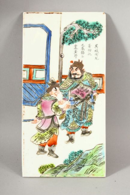 5 CHINESE FAMILLE ROSE PORCELAIN PANEL SECTIONS - each decorated with scenes of figures / warriors with upper calligraphy, each panel measures 26cm high x 13.5cm wide.
