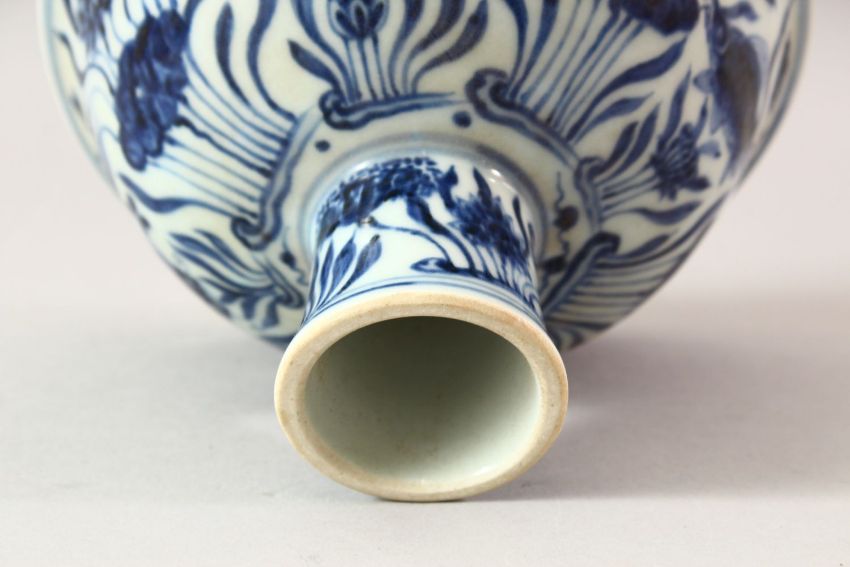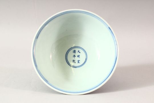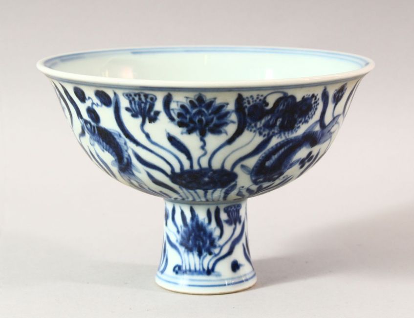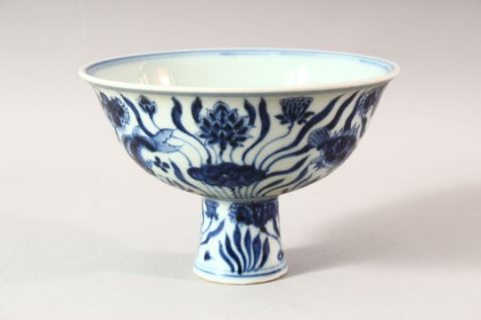A CHINESE BLUE AND WHITE PORCELAIN STEM CUP, decorated with fish amongst aquatic flora, bowl 17cm diameter, 11.5cm high.