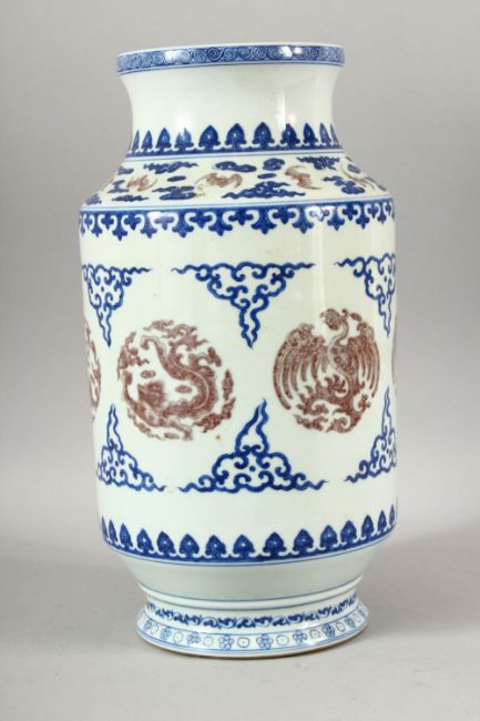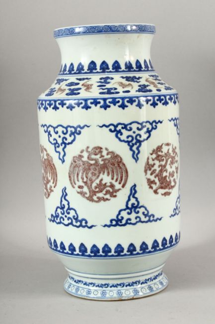 A CHINESE BLUE AND RED VASE, painted with bats, dragons and stylised motifs, 36cm high.