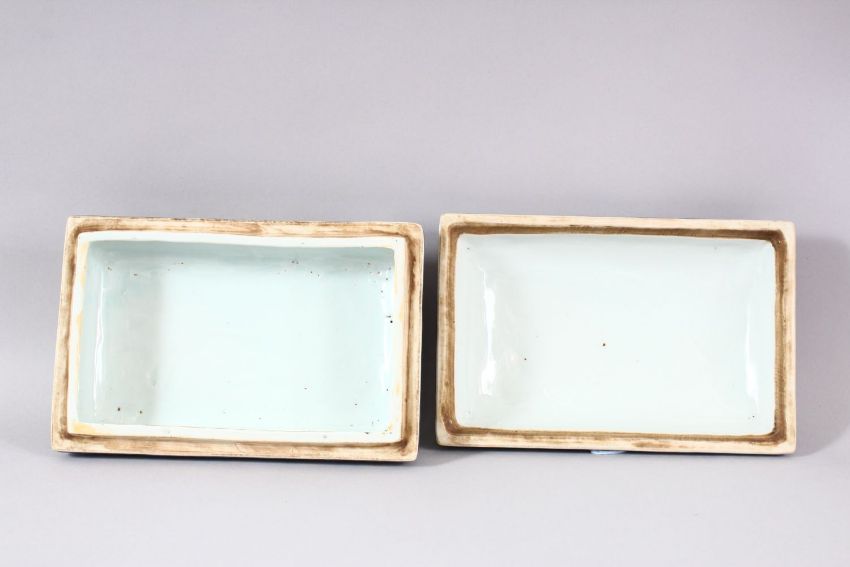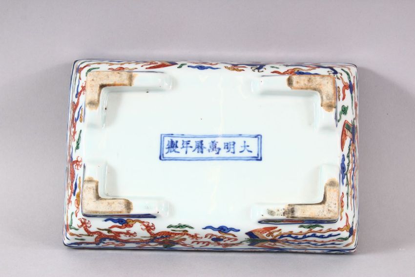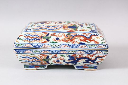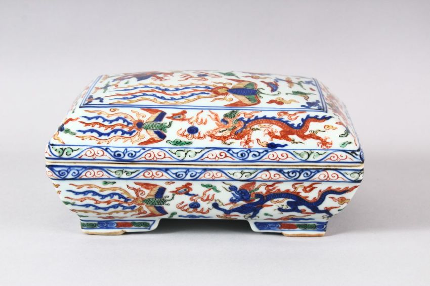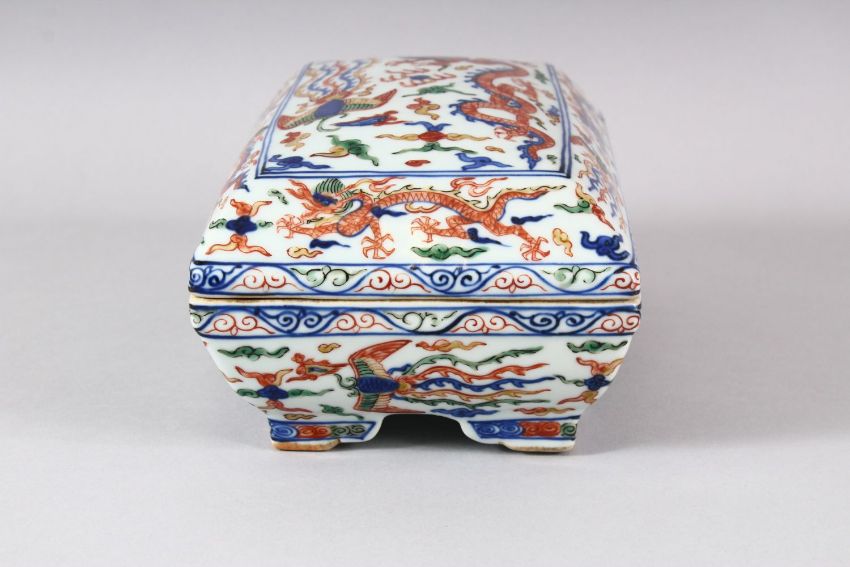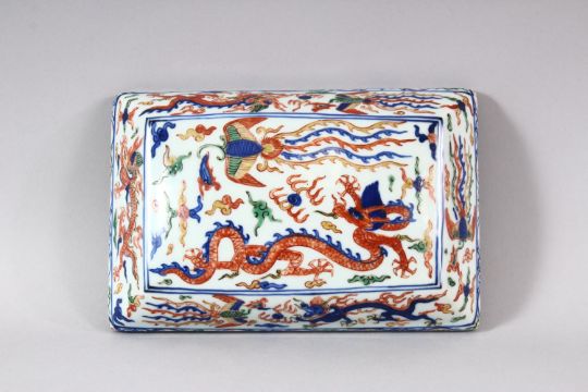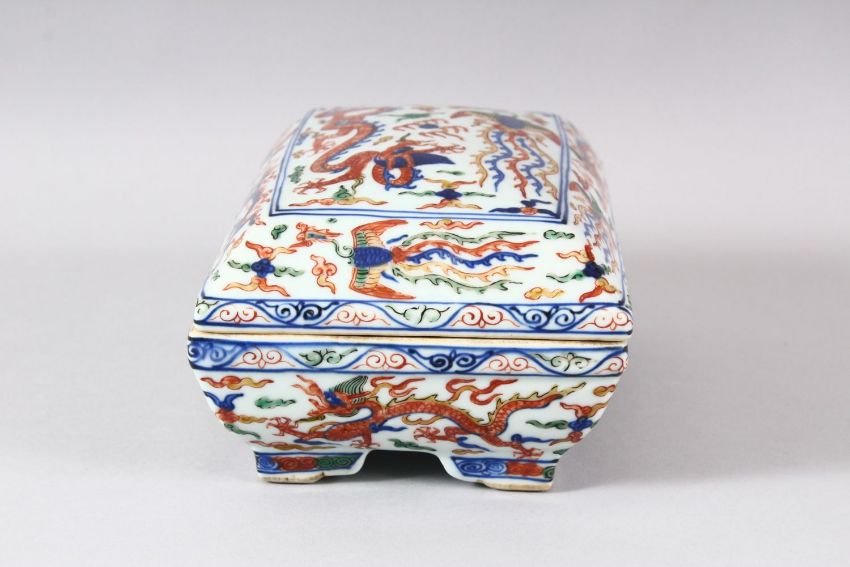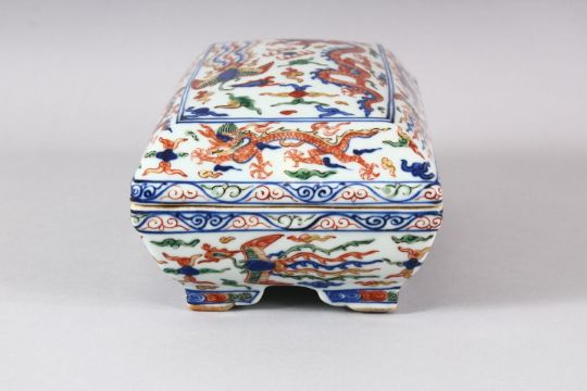 A CHINESE MING STYLE WUCAI PORCELAIN RECTANGLAR BOX AND COVER, painted with dragons and phoenix, the base with blue six character mark, 20cm x 13.5cm.
