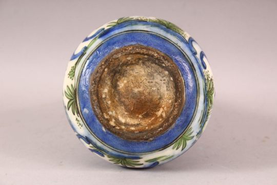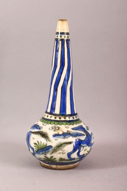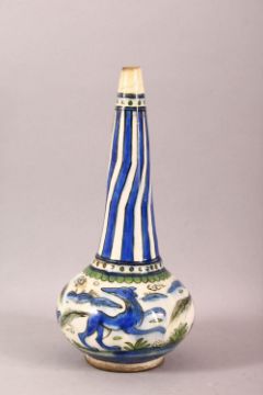 AN IZNIK QAJAR GLAZED POTTERY WATER SPRINKLER, painted with foxes, 27cm high.