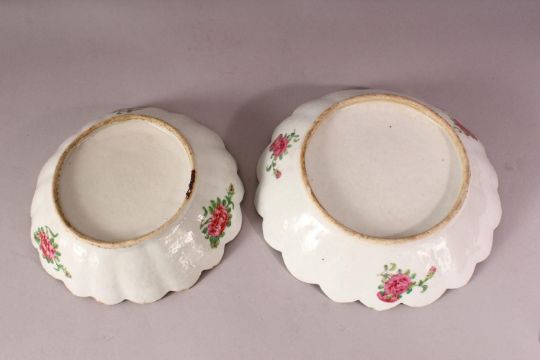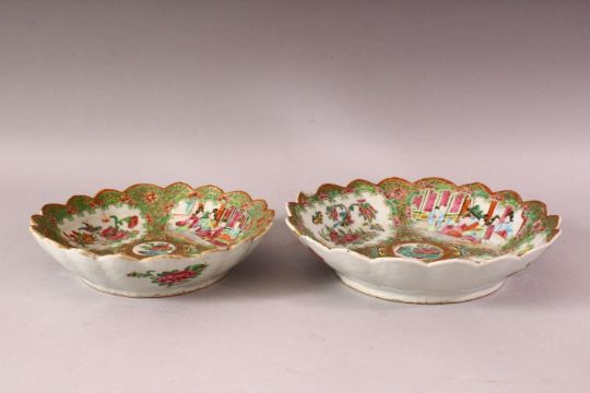 TWO 19TH CENTURY CHINESE CANTON FAMILLE ROSE PLATES - each decorated with panels of figures with birds and flora, with a foliate ground with butterfly. 21cm & 24cm