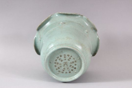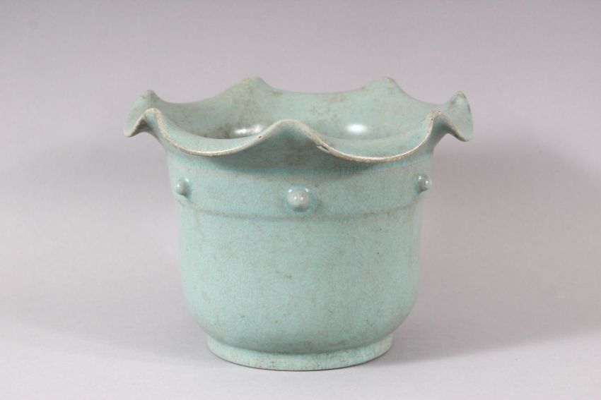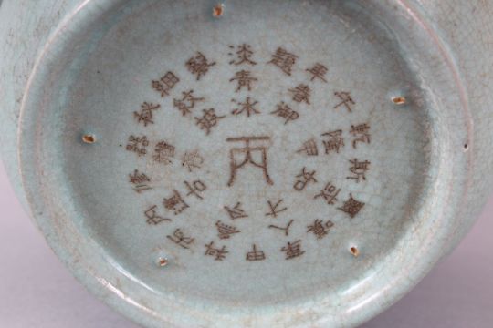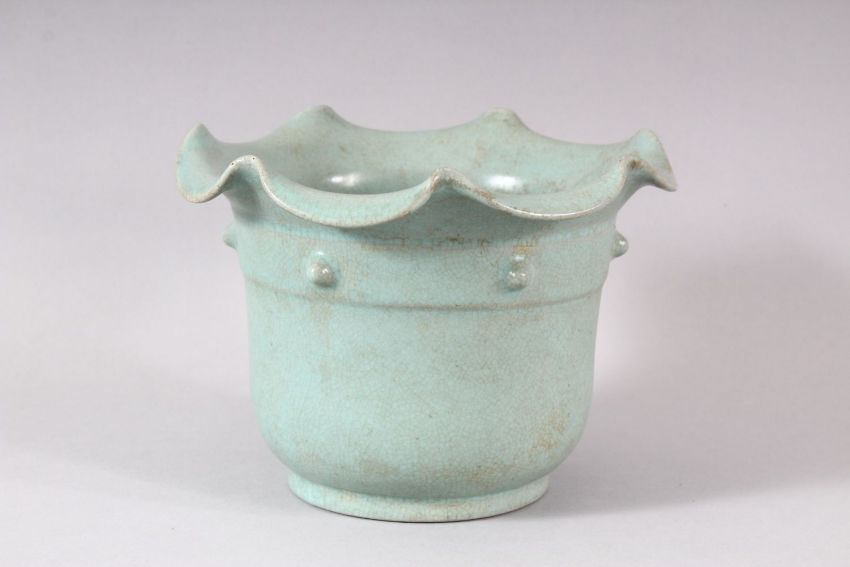 A CHINESE SONG STYLE CELADON PLANT POT, with circular script to base, 18cm diameter, 13cm high.