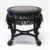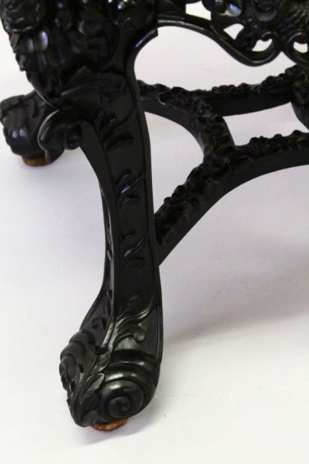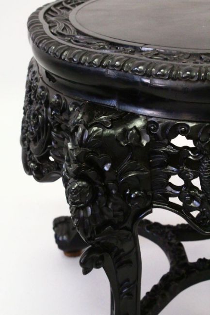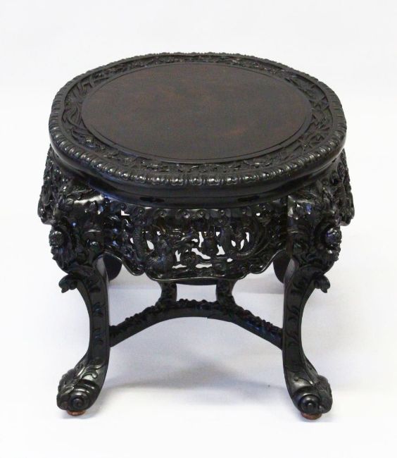 A SUPERB CHINESE CARVED EBONY STAND, the top border carved with bamboo, cherry blossom and lilies above and well carved and pierced frieze, depicting dragons chasing the flaming pearl of wisdom, supported on floral carved curving legs united by stretchers, 50cm diameter, 48cm high.