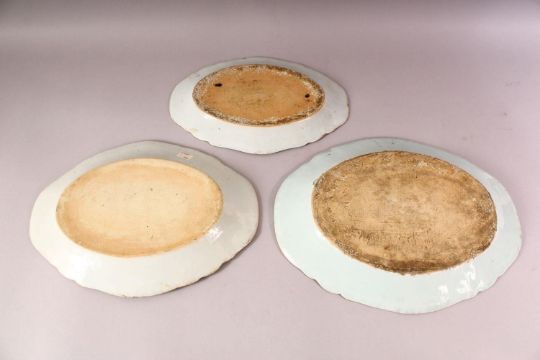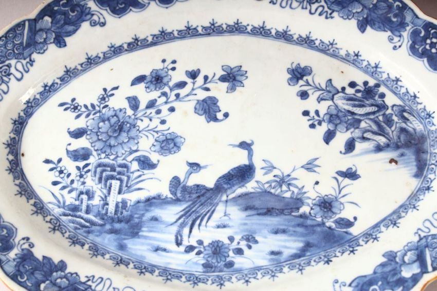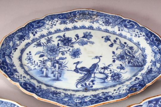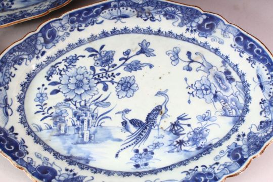 3 X 18TH CENTURY CHINESE BLUE & WHITE PORCELAIN MEAT DISHES - each dish decorated with scenes of egret amongst landscapes, 37cm down to 29.5cm