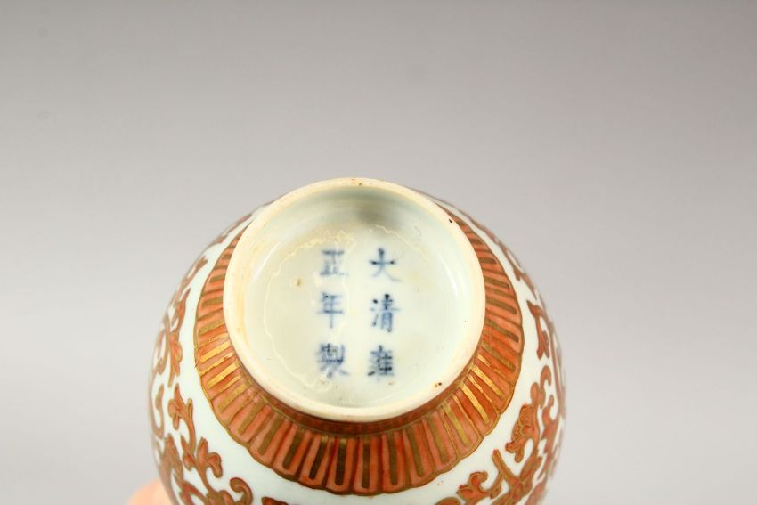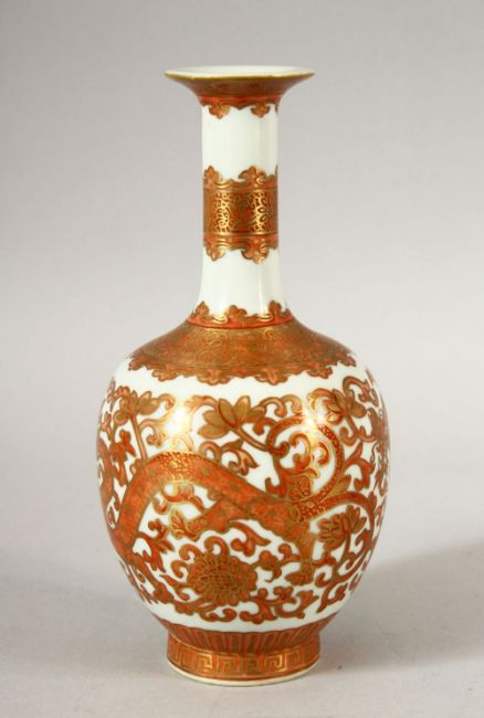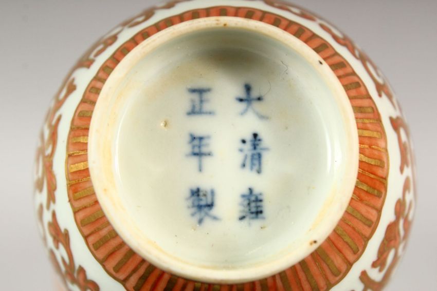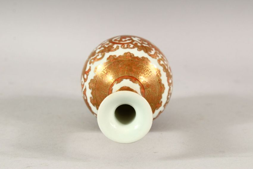 A VERY GOOD SMALL RED AND GILT BULBOUS VASE with continual dragon design, six character mark in blue, 15cm high.